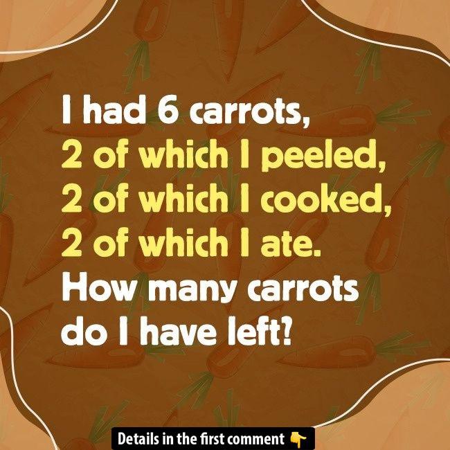 Here’s a tricky carrot riddle for you: “I had 6 carrots, 2 of which I peeled, 2 of which I cooked, and 2 of which I ate. How many carrots do I have left?” At first, this may seem simple, but it hides a clever twist. Many rush to assume the wrong answer, but the solution lies in understanding the overlap of actions. Take a moment to think it through before checking out the solution! Ready to challenge yourself?