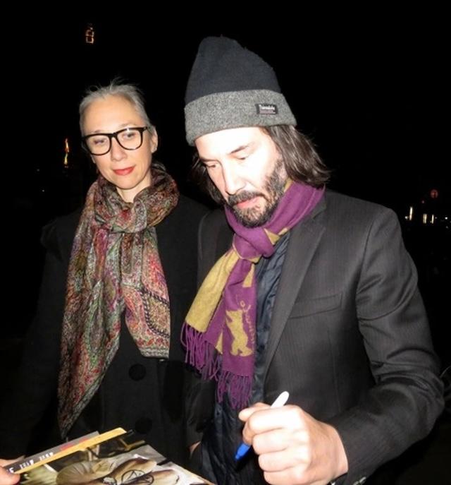 Keanu Reeves and Alexandra Grant embrace affectionately during a red carpet event, radiating warmth and love