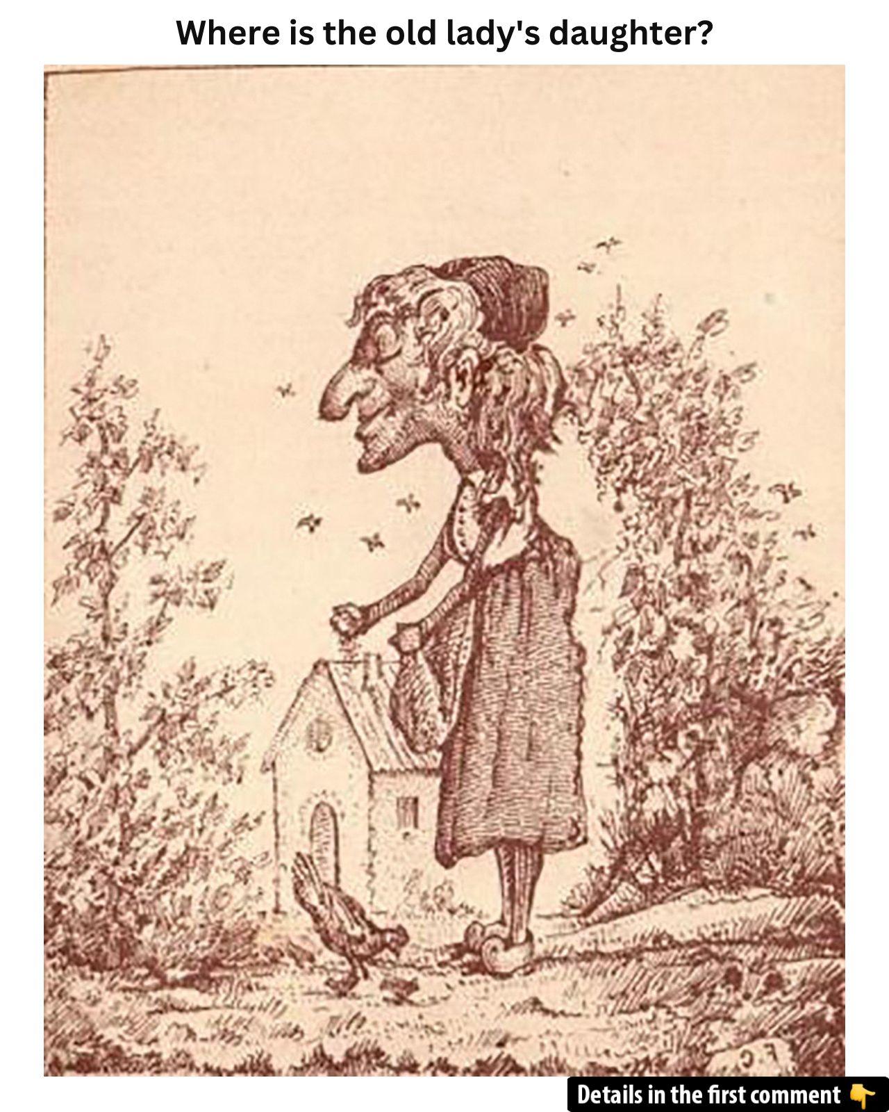 This optical illusion puzzle will test your observation skills! At first glance, you might see a simple drawing of an old lady standing in front of a house, but there’s more than meets the eye. Can you spot the hidden daughter? It’s harder than you think! Take a closer look and see if you can figure out where she’s hiding. Don’t worry — we’ll guide you step by step to help you find the answer. Ready to try? Let’s see if you can find her before the hint!