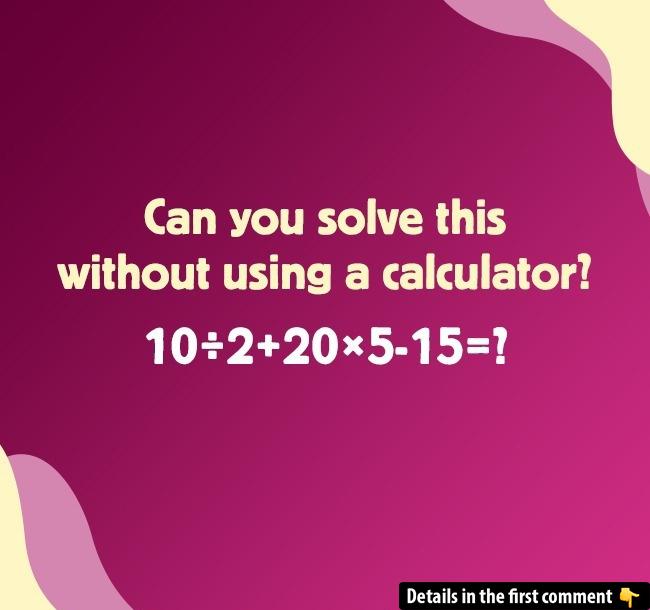 Can you solve this math puzzle without reaching for a calculator? Here’s a challenge for your brain: 10 ÷ 2 + 20 × 5 – 15. It may look simple at first glance, but the trick lies in following the right order of operations. Test your skills, solve it, and let us know your answer and how you worked it out in the comments below! Ready to give it a go? Don’t forget to challenge your friends and see if they can beat your time!